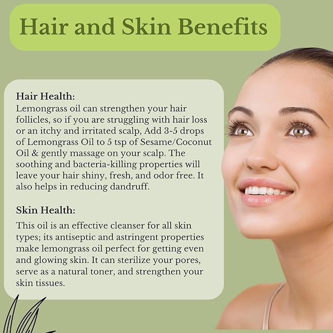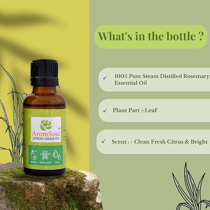 • Mood Enhancer: The calming and fresh lemony aroma of lemongrass oil helps to uplift mood and spirit when used in aromatherapy or with aroma diffuser for a refreshed and energized feeling.