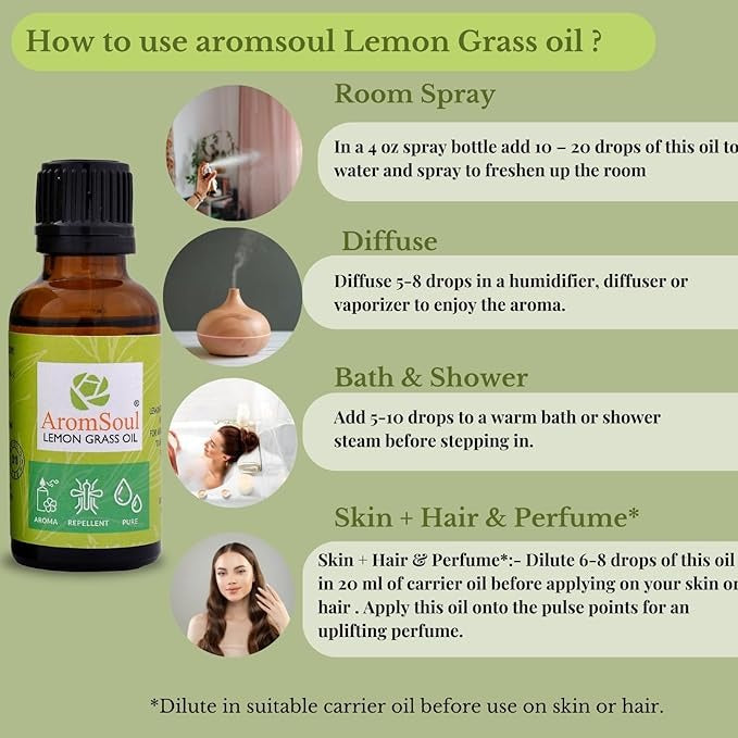 • Mood Enhancer: The calming and fresh lemony aroma of lemongrass oil helps to uplift mood and spirit when used in aromatherapy or with aroma diffuser for a refreshed and energized feeling.