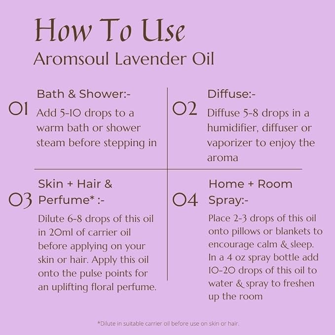 • Aromatherapy Benefits: With its calming and relaxing properties, this lavender essential oil is perfect for use in aromatherapy to promote relaxation and relieve stress. It also helps in a calm relaxing sleep.