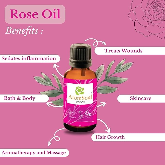 • SKIN CARE & HAIR GROWTH:Rose essential oil is widely used for cosmetic purposes as it is very good for your skin. It can help you fade away scars left over from acne, boils, pox, and injuries and leave you with smooth skin. It can even help you fade away stretch marks, fat cracks, scars from surgeries, and so on. The antioxidant properties of this oil help with healing your skin quickly. It promotes hair growth and works like a eau de parfum for body.
