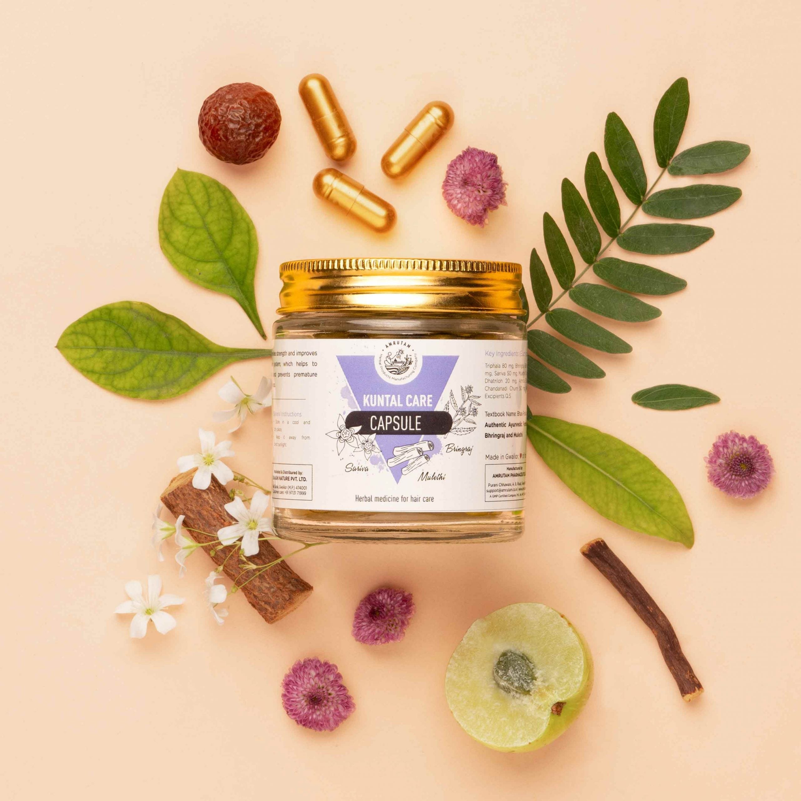 • Amrutam Kuntal Care Capsule is made with age-old herbs that holistically strengthen hair, promote growth, and prevent premature greying and hair loss.