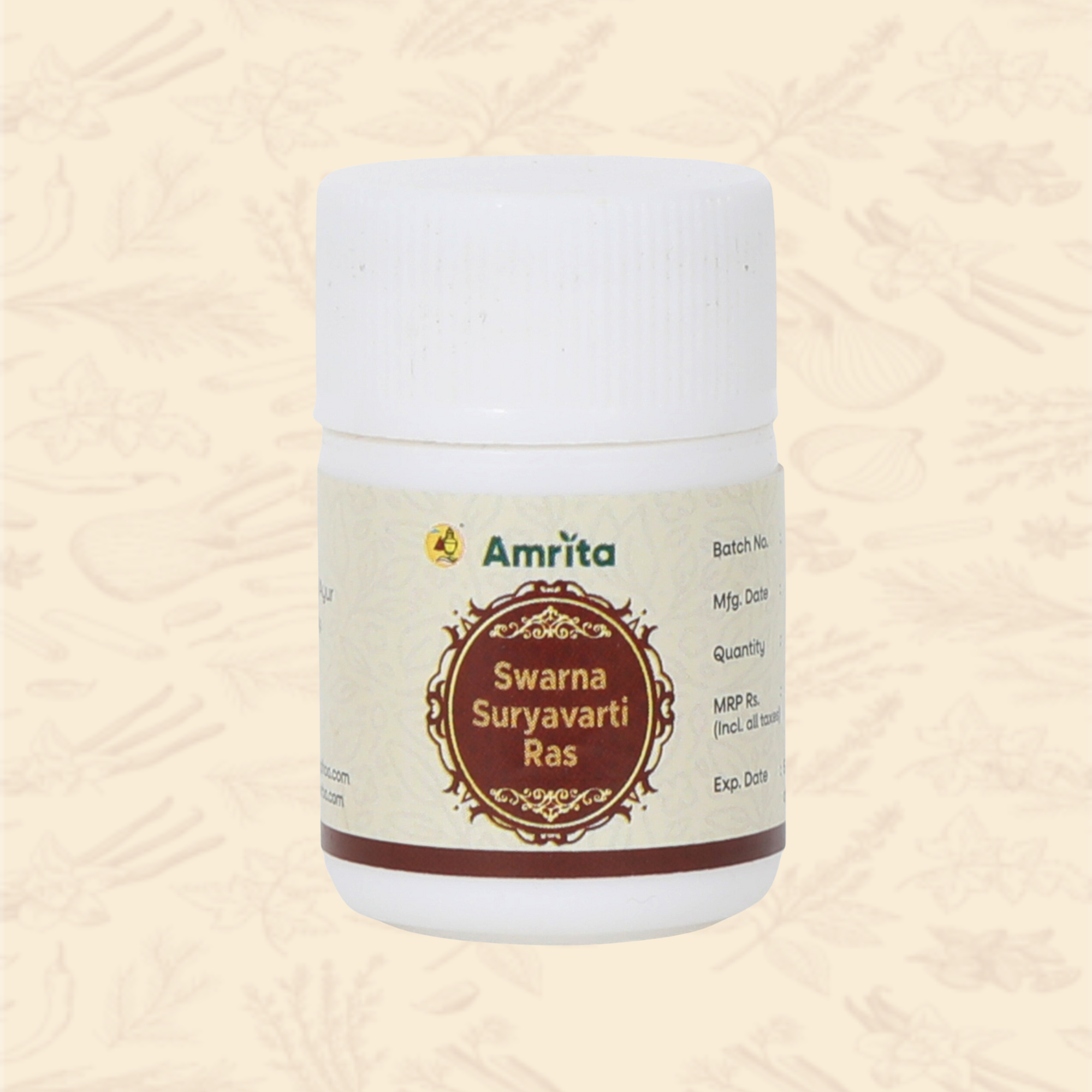 Amrita Swarna Suryavati Ras is a classical Ayurvedic herbo-mineral formulation enriched with pure gold. It is valued for its natural balancing and revitalizing qualities, supporting overall wellness, energy.