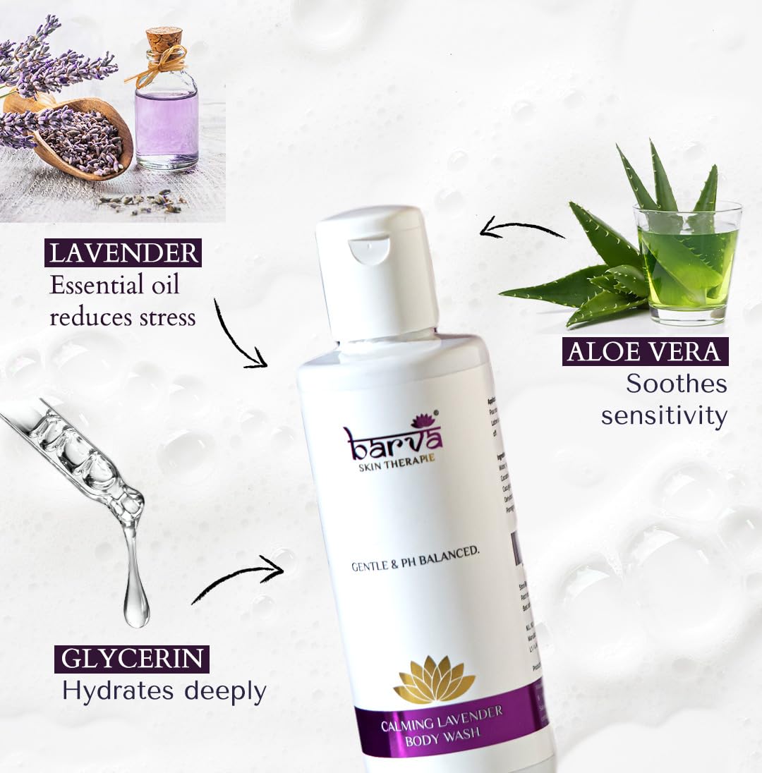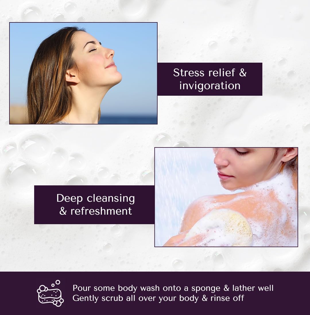- LAVENDER ESSENTIAL OIL, its main ingredient of this body wash/shower gel, calms the brain, reduces body ache, and relieves stress.