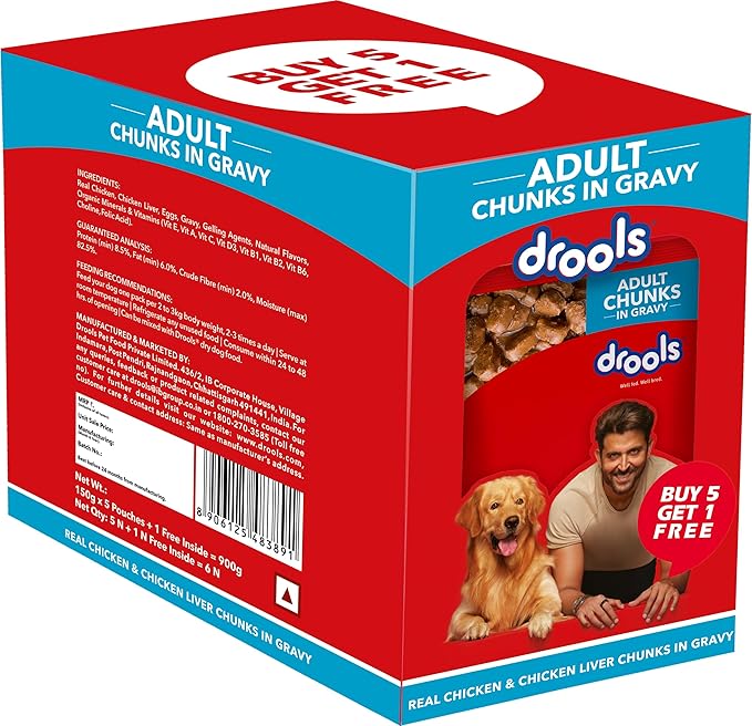 Drools Adult Wet Dog Food, Real Chicken and Chicken Liver Chunks in Gravy 0.9k Gms | 150 Gms Each | Pack of 6