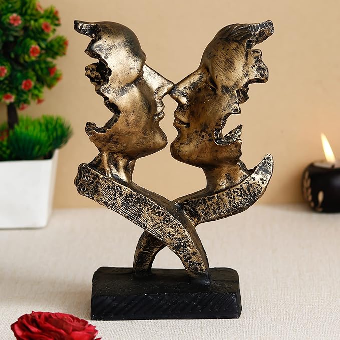 - This beautiful decorative piece is handcrafted and features a detailed design of a man and woman sharing a passionate kiss. The antique finish gives it a vintage and elegant look that will enhance any home decor item. Made of high-quality polyresin, this showpiece is durable and long-lasting.