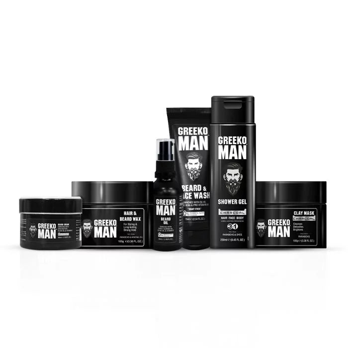 - Greeko Man Grooming Range includes Beard Oil, Beard & Face Wash, Beard Cream, Clay Mask, Shower Gel, and Beard & Hair Wax.