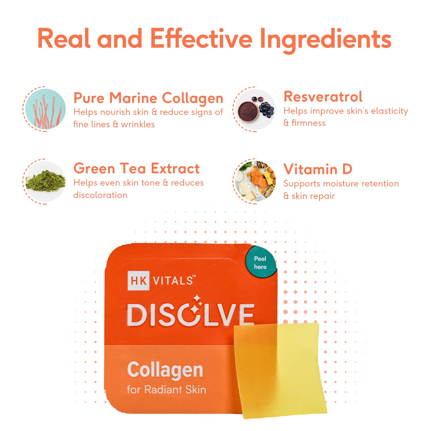 - HealthKart HK Vitals Collagen DISOLVE is India’s first real collagen in strip format. It contains pure marine collagen along with skin-nourishing ingredients like Grapeseed extract, Green tea extract and Vitamin D