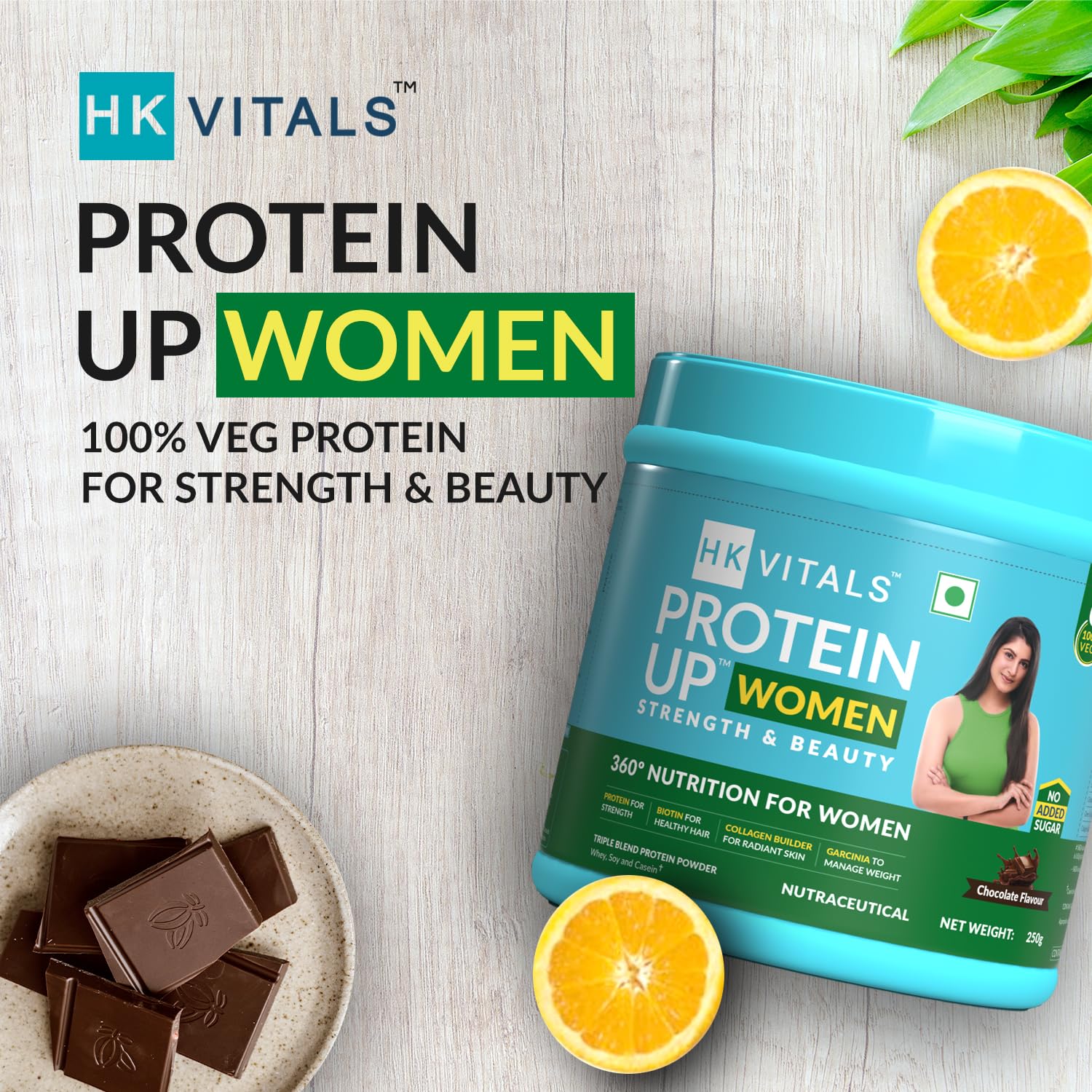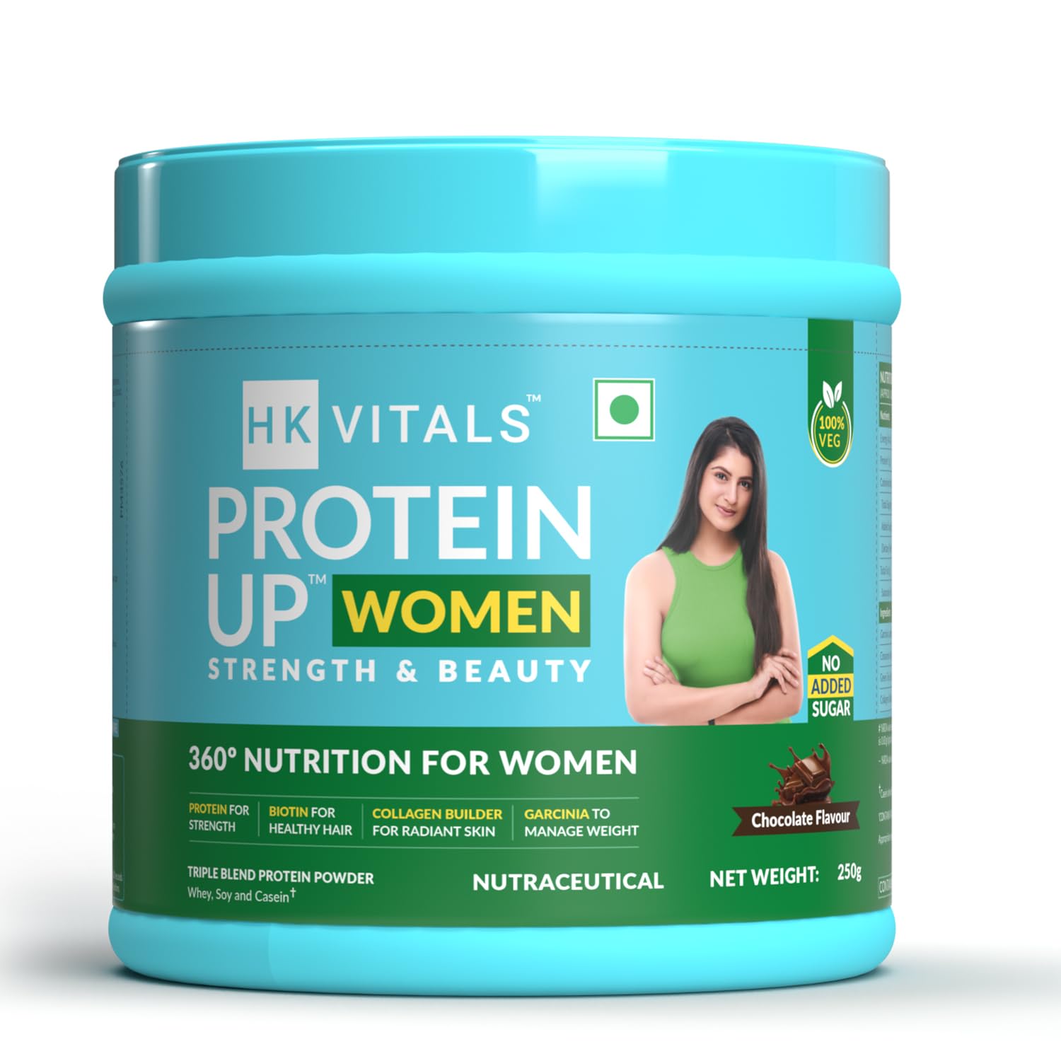 • HK Vitals ProteinUp Women is available in delicious chocolate & vanilla flavours. Take 200 ml of chilled water and add 1 level scoop (25 g) of protein powder. Mix vigorously until uniform to make a chocolate protein shake