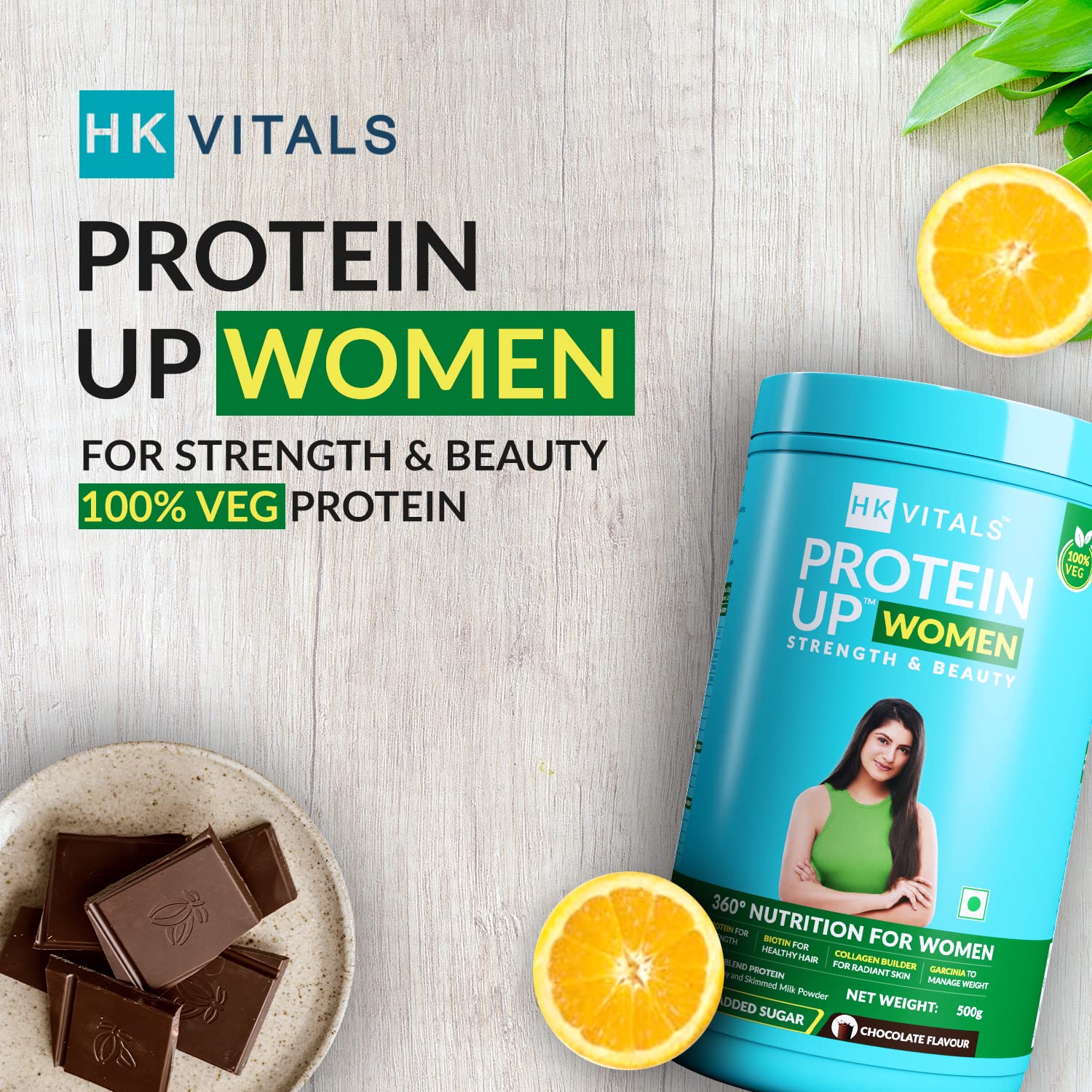 • HealthKart HK Vitals ProteinUp Women is an all-in-one vegetarian protein supplement for women’s health & beauty needs especially post their thirties