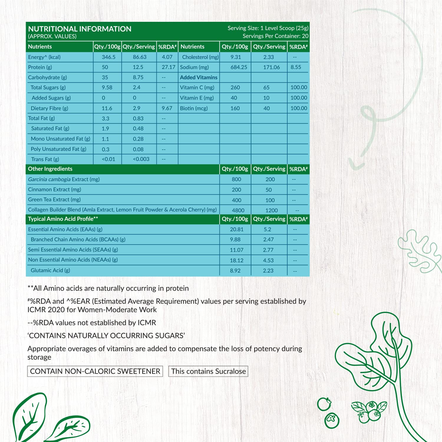 • TRIPLE PROTEIN SOURCES: This vegetarian protein powder for women has 12.5 g of high-quality protein from three sources - whey, soy, and skimmed milk powder. Protein helps in maintaining muscle mass & strength