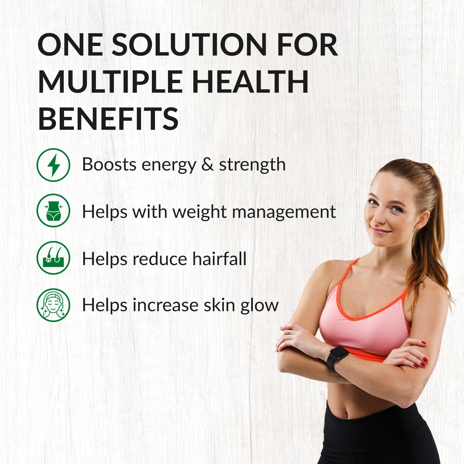 • HK Vitals ProteinUp Women contains 100% RDA of hair vitamins - Biotin, Vitamin C, & Vitamin E which help strengthen hair from roots. Biotin also helps in maintaining skin and nails health