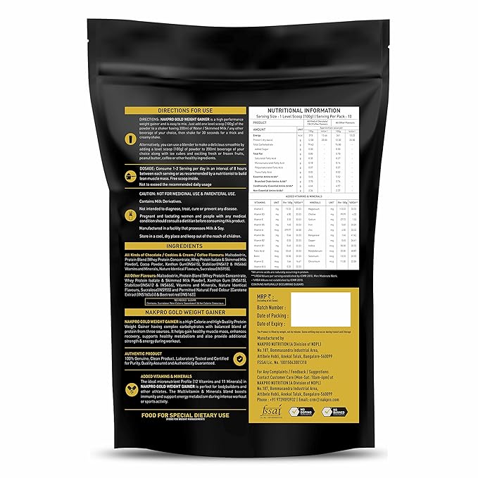 - Nakpro Sports Gold Weight Gainer is weight gaining formulation proides maximum nutrition 6:1 ratio (77g carbs & 12g proteins) recommended for both male and female