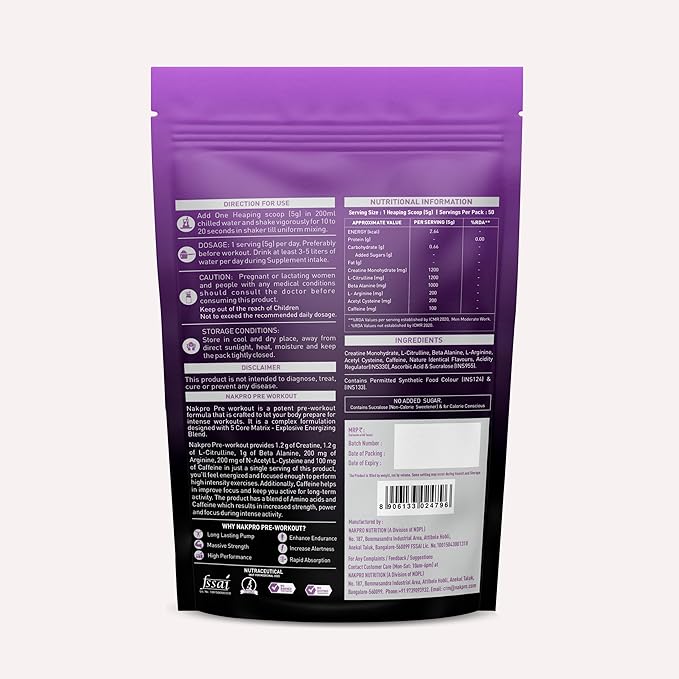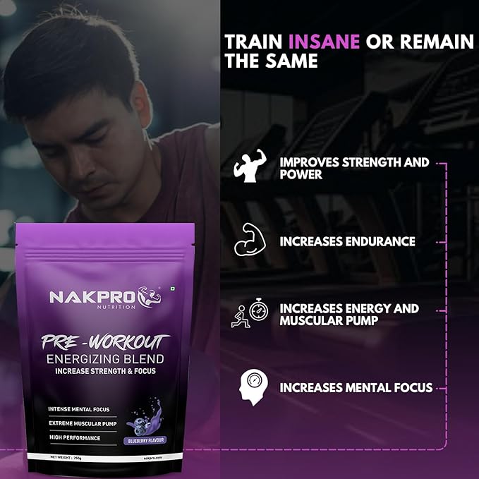 • NAKPRO Pre workout is a Pre-workout drink with Energizing blend of Creatine monohydrate, L-citrulline, Beta-alanine, L-Arginine & Acetyl Cysteine along with focus booster containing Caffeine.