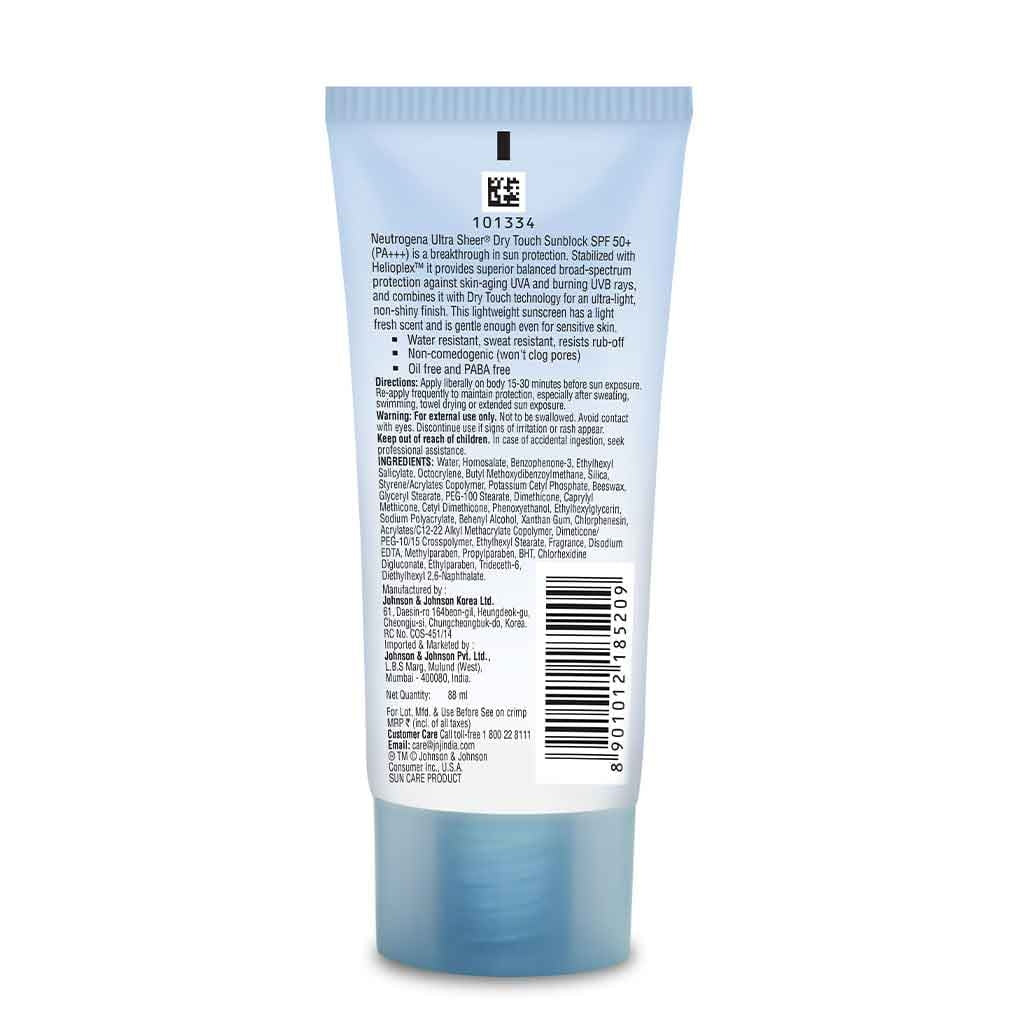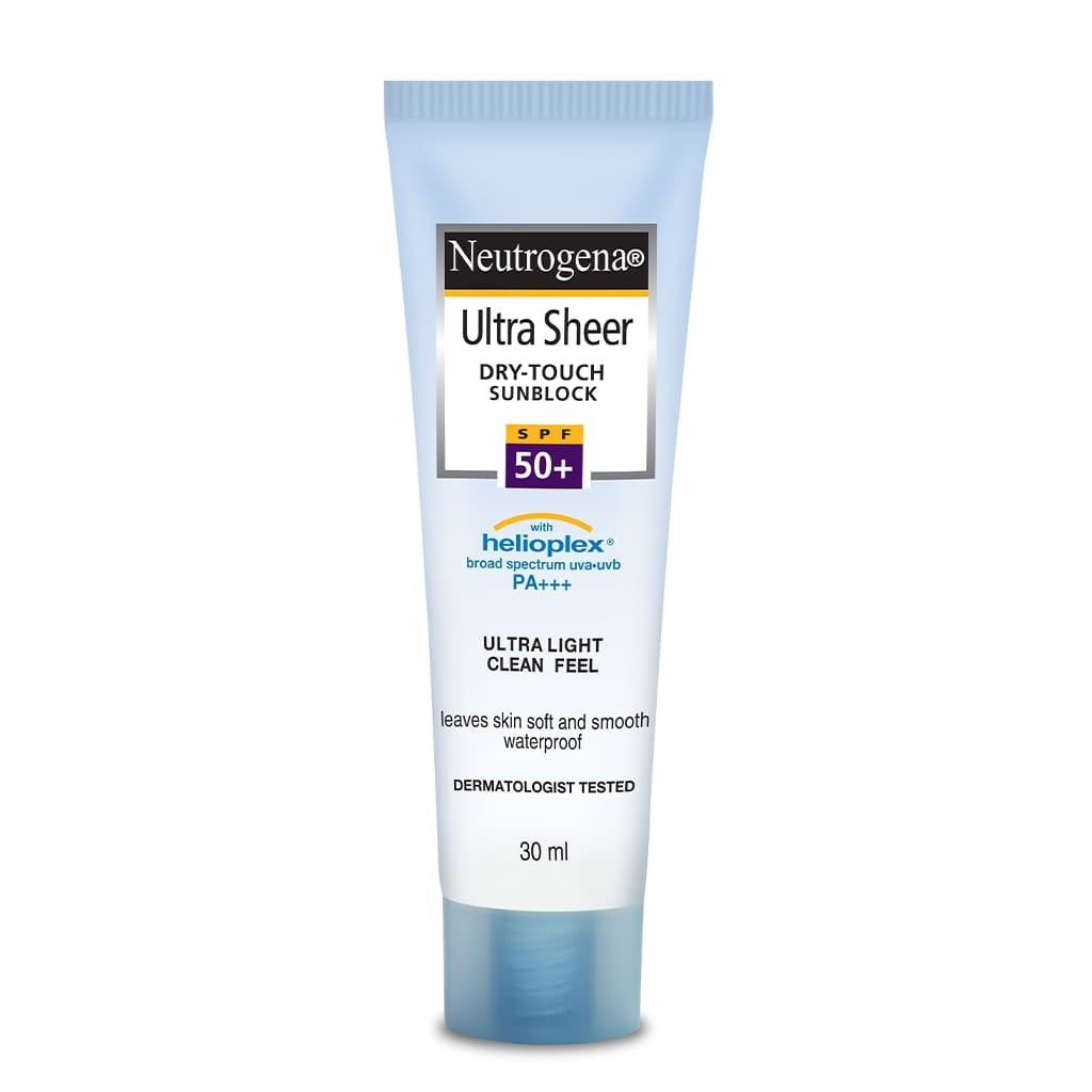 - Neutrogena® Ultra Sheer Dry Touch Sunblock SPF 50+ has Helioplex™ Technology which offers powerful protection against sun damage while leaving a weightlessly invisible feeling on your skin.