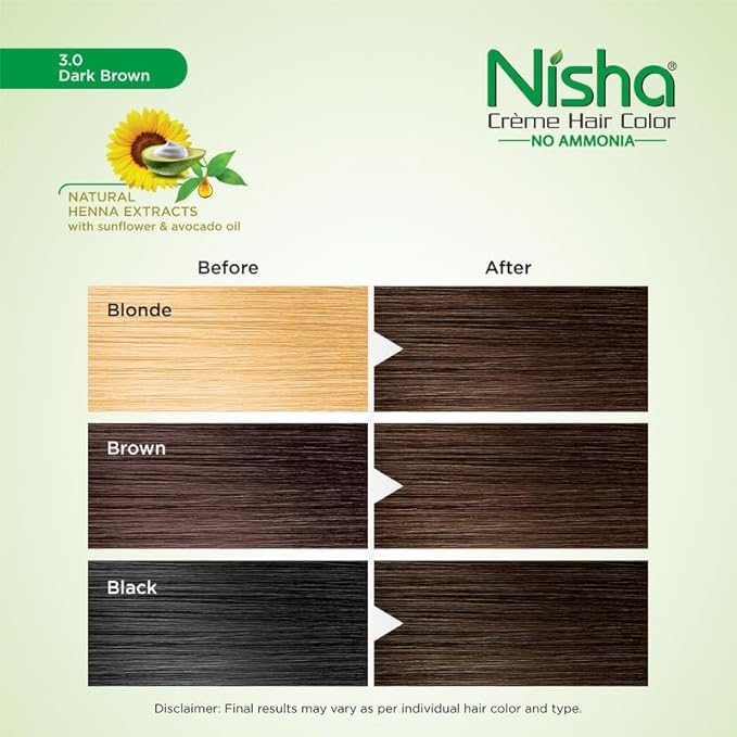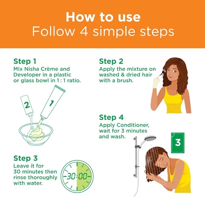 - Package includes- 1 Nisha 60ml Developer Bottle, 1 Nisha 60gm hair colorant Tube, 3 sachets of 6ml Conditioner, 1 pair hand gloves, 1 brush and 1 instruction leaflet for home use.