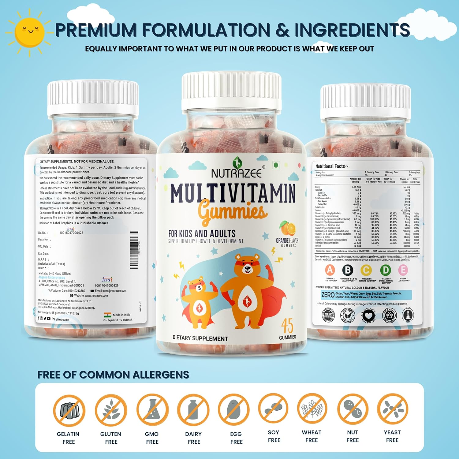 • Nutrazee Multivitamin vegetarian gummies are a fun and tasty way to get your daily dose of vitamins in a yummy natural orange flavour gummy bear.