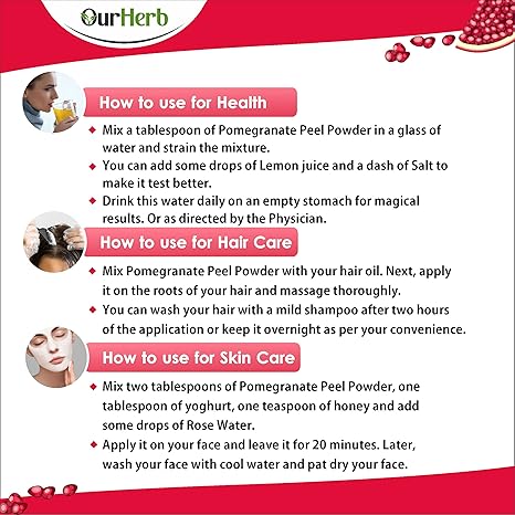 - 100% Pure and Organic: OurHerb Pomegranate Peel Powder is made using handpicked and organic ingredients. It can be used on hair and face.