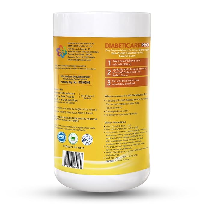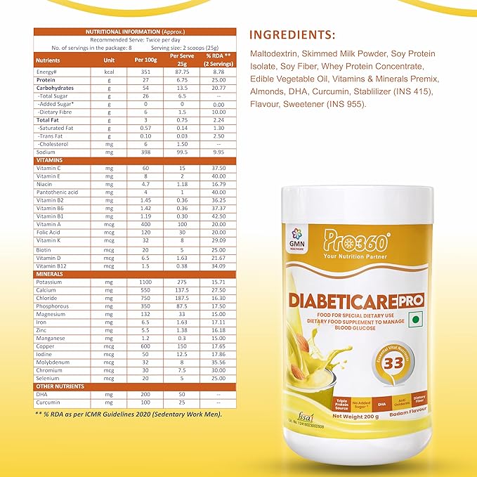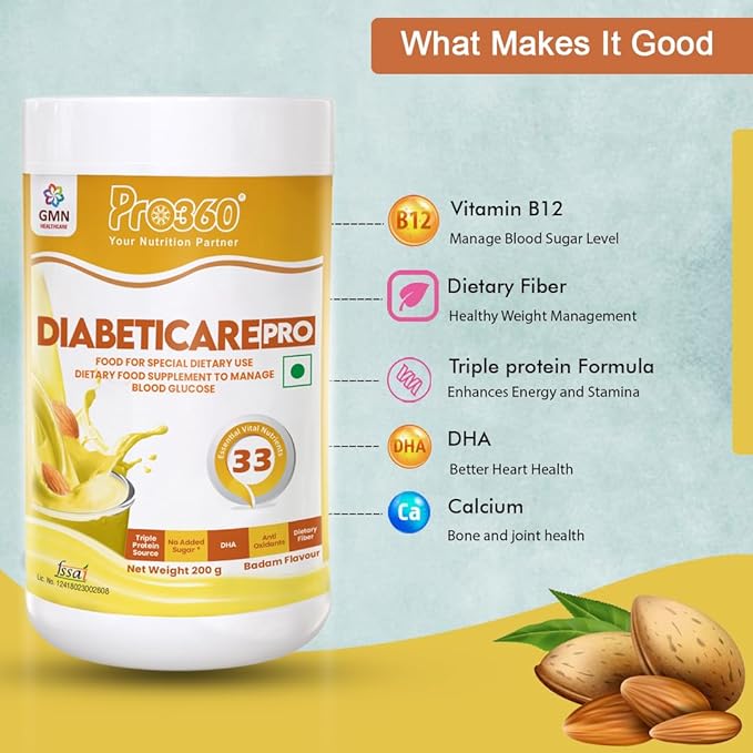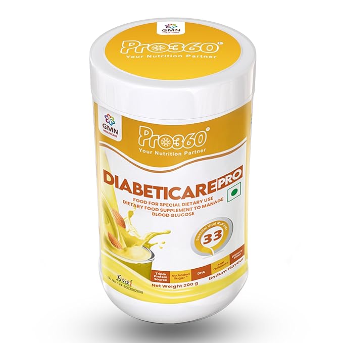 - Pro360 diabetic care, provides advanced nutrition for diabetic management, comes in delicious flavours of vanilla ice cream, chocolate, badam, roasted coffee.