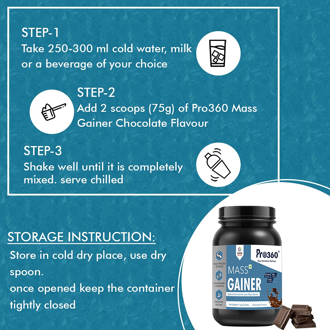 - Directions for mixing: add 2 scoops (75g) of pro360 mass gainer chocolate flavour in 250-300ml of cold milk/ water or beverage of your choice. Use an electric blender for quick mixing. Add peanut butter, fresh fruits or nuts for better results.