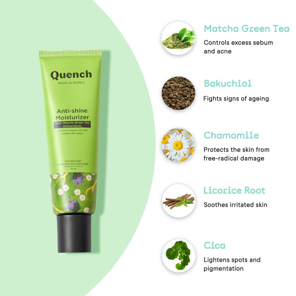 • Are you looking for a mattifying moisturizer that strikes the perfect balance of oil-control, non-clogging ingredients and nourishment? We believe we have hit that sweet spot! The Quench Matcha Better Anti-Shine Moisturizer with its ultra-hydrating yet lightweight formula absorbs instantly and makes your skin healthy, supple and smooth.