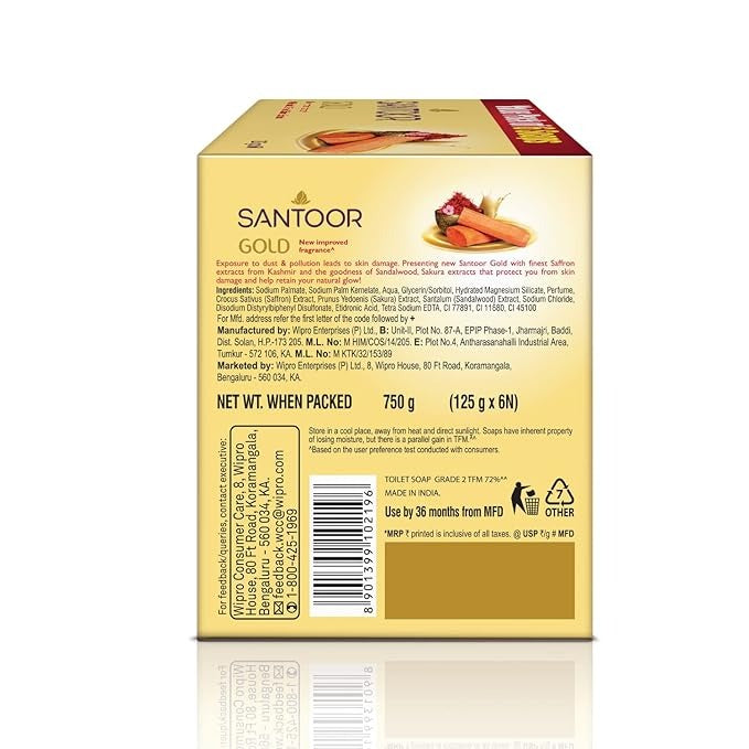 - Touch of Luxury: Santoor Gold Soap is enriched with the goodness of Sandalwood, Kashmiri Saffron, and Sakura extracts that provide you with soft and glowing skin.