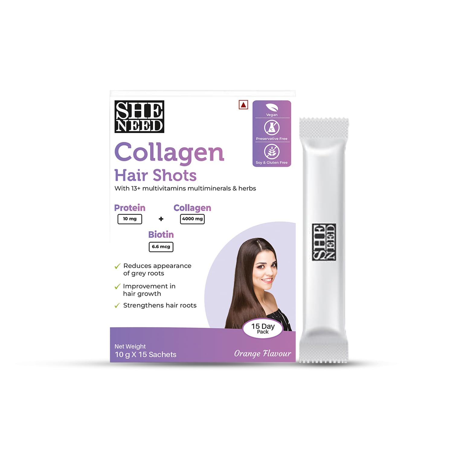 - Collagen Hair Shot by Sheneed Nutrition is a premium collagen boost that provides optimized collagen nutrition to specifically support and support the health and beauty of hair with 10,000 mg of high quality hydrolysed bovine collagen and other important ingredients.