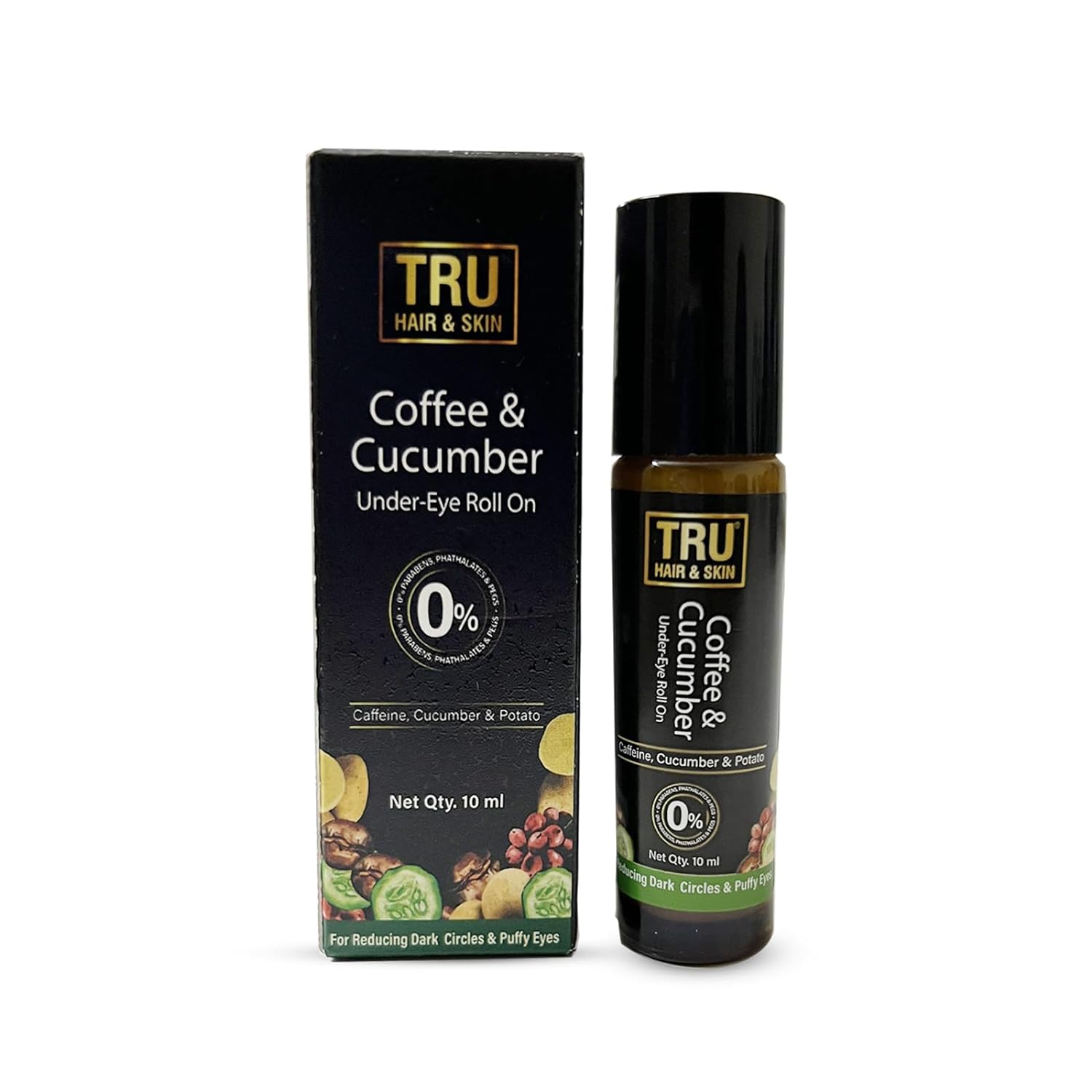 - 0% Harmful Chemicals – TRU HAIR & SKIN Coffee & Cucumber Under-Eye Roll On and all other TRU HAIR & SKIN products contain 0% Parabens, Sulphates and other harmful chemicals.